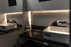 Maximizing the Pyxis 30wa’s larger interior volumes has allowed Carlo Galeazzi’s Studio to breathe life into an exquisite italian masterpiece, by blending soft modern tones, applying warm and natural materials, and enforcing an exhaustive attention to detail. Luminous, spacious, and elegant the master cabin features a completely symmetric king size berth, and a second double berth for guests. Practical by design, the Pyxis 30wa offers plenty of standing room, also in its fully private and enclosed restroom, as well as an extended cabinetry layout.