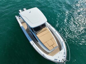 Born to the task with its wide, deep, self-bailing cockipt, and anti-skid deck the innovative Pyxis 30wa Fishing has been completely revisited to meet the needs and wishes of even the most demanding anglers. Configured as a six person saloon and operations center complete with flush-folding seats,pIenty of dedicated in-deck storage and gunwales, the set up also features an exclusive integrated transom module. Housing IiveweII, fish box, rod holders, tray-tackle rack, systems and so much more